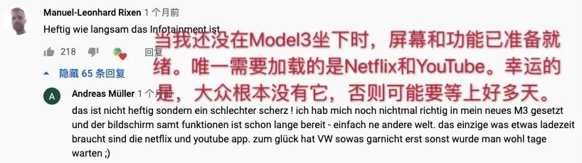 “我在Model3里还没完全坐下,屏幕和功能就已经准备好很久了,只有Netflix和YouTube需要等待加载。”一位Model 3车主在评论中补完刀又一刀:“幸运的是,大众没有Netflix和YouTube,不然你可能要等上几天。”