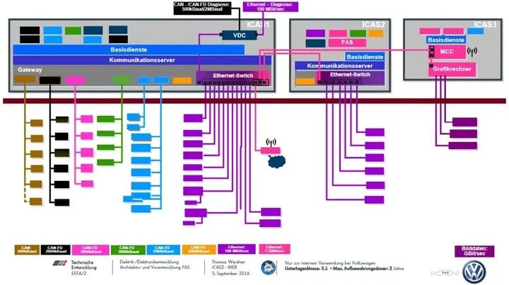 具体而言,MEB平台的电子电气架构,围绕三个域控制器搭建,分别是ICAS1、ICAS2和ICAS3。