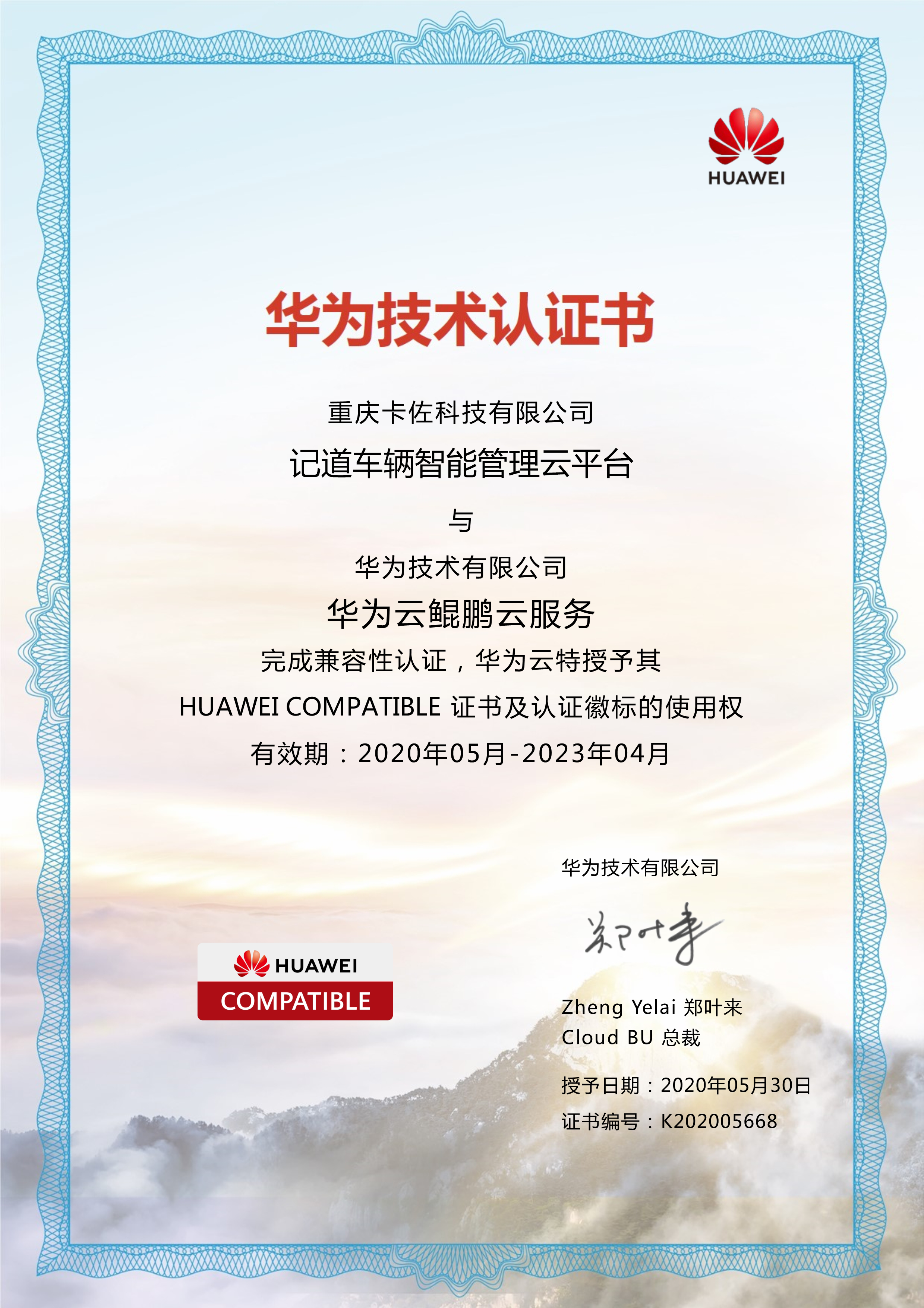 近日,卡佐科技旗下记道®车辆智能管理云平台产品通过华为技术认证,完成与华为鲲鹏云服务的兼容性测试,并获得华为的技术认证书。