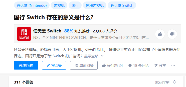 自从腾讯宣布合作任天堂开始,国行switch可谓是争议不断。这款在海外依旧已久,却是“初入”国内的游戏设备自上市以来就引起了玩家圈子中的无数吐槽,运营、游戏等等都是网友们嫌弃的对象,而国行玩家索性站上了主机游戏鄙视链的最低端,成了被玩家乃至云玩家取笑的对象,隔壁某乎上,一个名为“国行switch存在的意义”的问题更是被盖了三百多楼,吸引了上千人点赞。