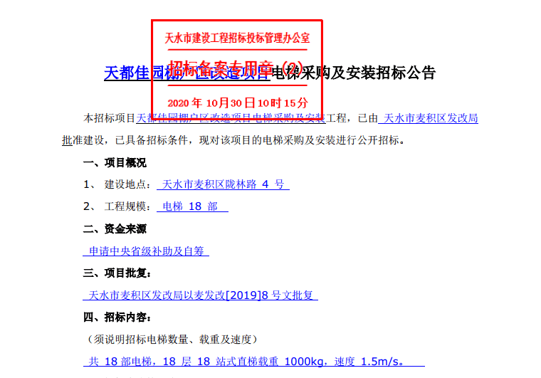10月30日,天水公共资源交易中心发布“天都佳园棚户区改造项目电梯采购及安装招标公告”,该项目已由天水市麦积区发改局批准建设,已具备招标条件,现对该项目的电梯采购及安装进行公开招标。天都佳园棚户区改造项目建设于天水市麦积区陇林路4号,计划共招标18部电梯,18层18站式直梯载重1000kg,速度1.5m/s。