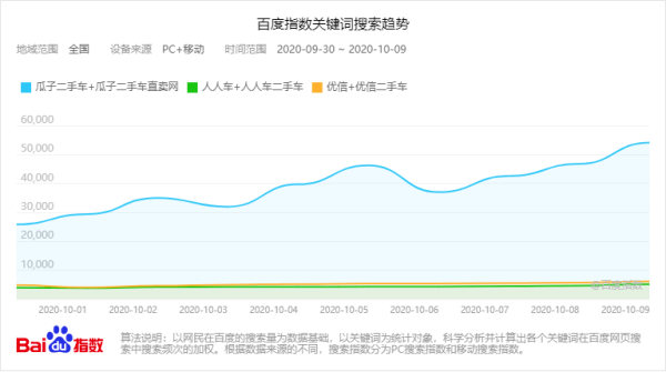 百度指数显示,三包服务广告上线后,瓜子二手车百度指数持续走强,大幅领先同业平台。9月30日至10月9日10天内,瓜子二手车百度指数增幅达109%,与行业第二、三名差值分别拉大至47994、48955,领先优势继续扩大。“买二手车,先找瓜子严选车”已成消费者的普遍选择。