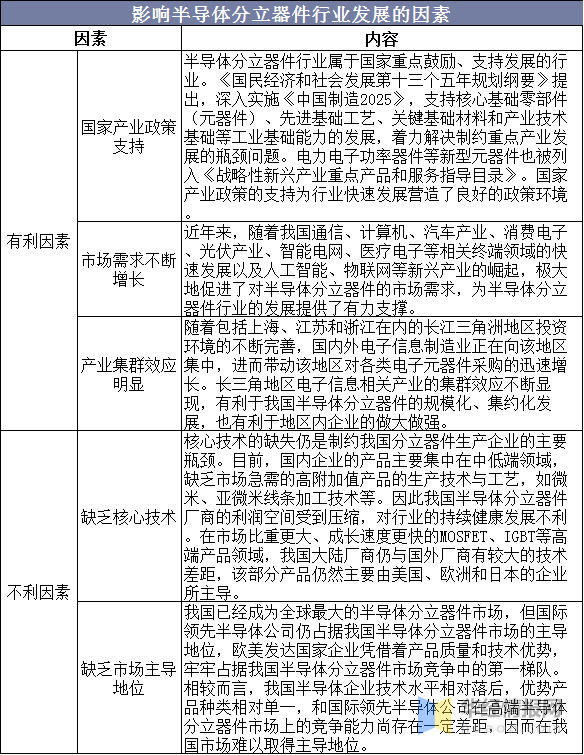 我国半导体分立器件行业起步较晚,主要发展途径是从国外引进及国内企业自主创新,逐步提升行业的国产化程度,满足日益增长的下游需求。目前影响半导体分立器件行业发展的有利因素主要有国家产业政策的支持、市场需求的不断增长与产业集群效应明显,不利因素主要有缺乏核心技术与缺乏市场主导地位。