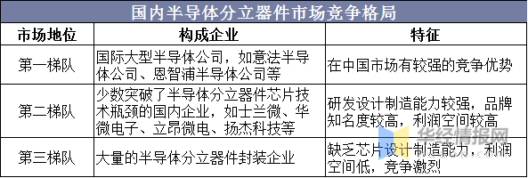 相较于国际半导体分立器件行业,我国半导体分立器件行业起步较晚,主要通过国外引进及国内企业自主创新,逐步提升行业的国产化程度,满足日益增长的下游需求。虽然在国内企业的不断努力下,我国半导体分立器件制造行业取得了很大的发展,但在高端半导体分立器件芯片的设计和制造方面,目前与全球领先水平尚存在差距。目前,国内的半导体分立器件企业大致可分为三个梯队,具体构成情况及特征为: