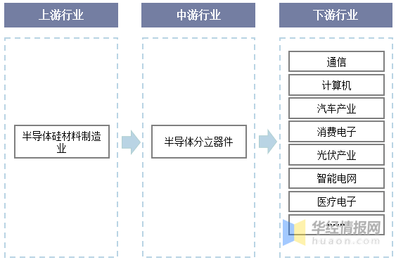 分立器件是指具有单一功能的电路基本元件,如二极管、晶体管、电阻、电容、电感等,主要实现电能的处理与变换,是半导体市场重要的细分领域。半导体分立器件上游产业为半导体硅材料制造业,半导体硅材料的技术能力、供应情况和价格水平直接对其下游分立器件行业产生影响。