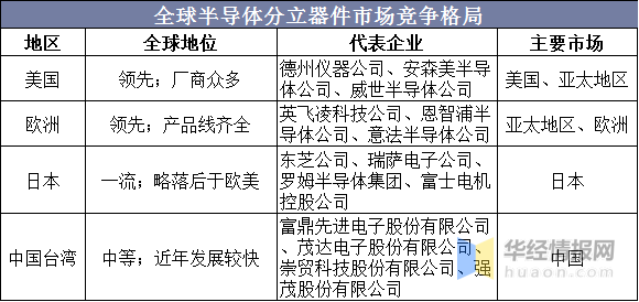全球市场方面,美国和欧洲半导体分立器件行业目前居于全球领先地位,随后是日本和中国台湾,各地区半导体分立器件行业代表厂商和主要市场如下表: