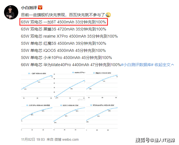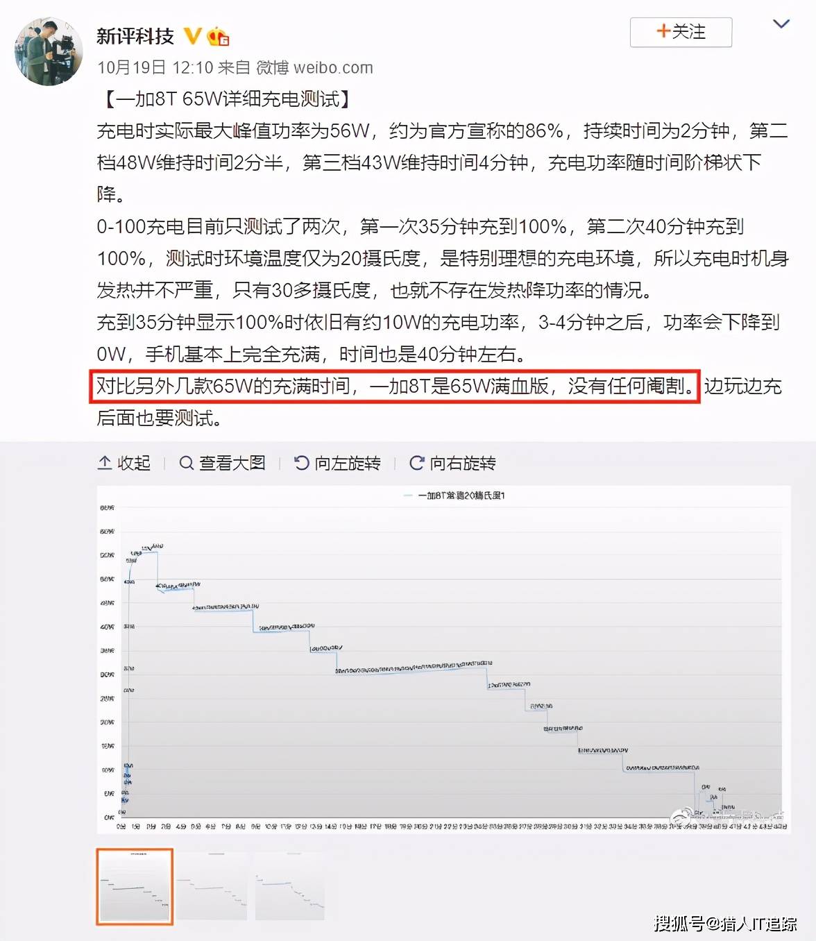 在100W以内的这些快充规格中,一加8T的65W快充效率最高,在@小白测评 和@新评科技 的测评数据中,位列同级竞品第一。