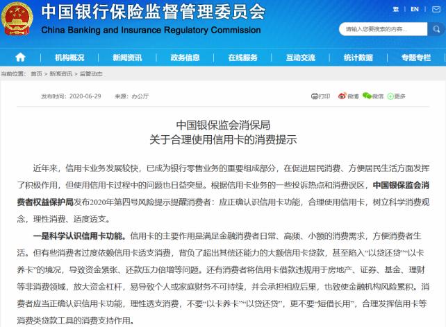 6月29日,银保监会消保局发布风险提示提醒消费者:应正确认识信用卡功能,合理使用信用卡,树立科学消费观念,理性消费、适度透支。
