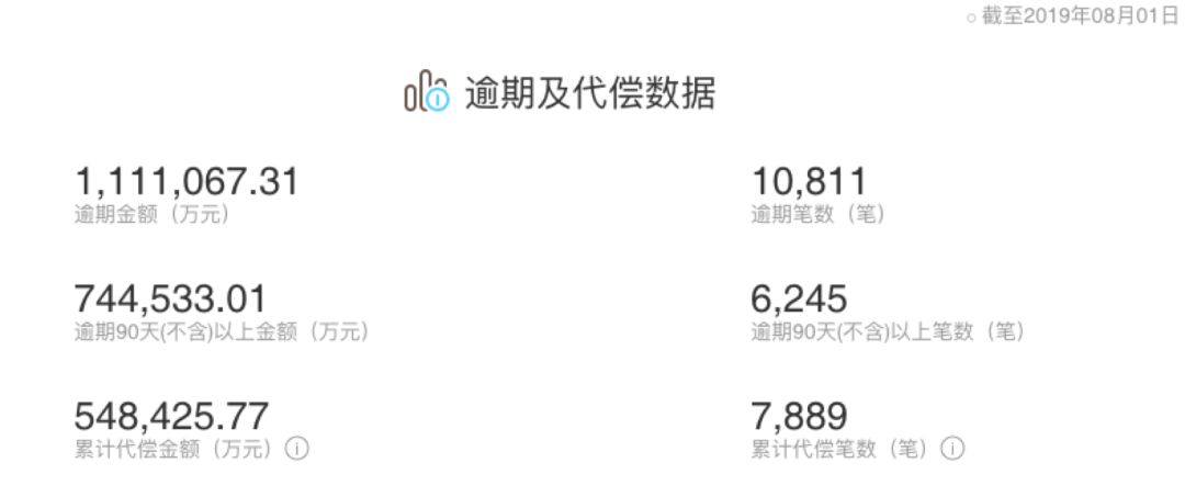 据爱投资披露,截至2019年8月1日,逾期金额111.10亿元,逾期笔数10811笔,其中逾期90天(不含)以上金额74.45亿元,逾期90天(不含)以上6245笔。