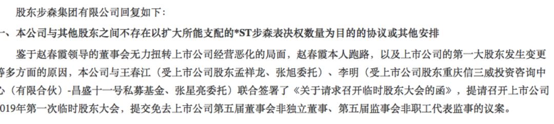 对于现任董事会的反击,“第一大股东阵营”很快展开“第二轮攻势”。8月19日晚间,在*ST步森回复深交所第313号关注函的公告中,步森集团、重庆信三威投资咨询中心(有限合伙)-昌盛十一号私募基金、张星亮、孟祥龙、张旭5名股东明确表示,