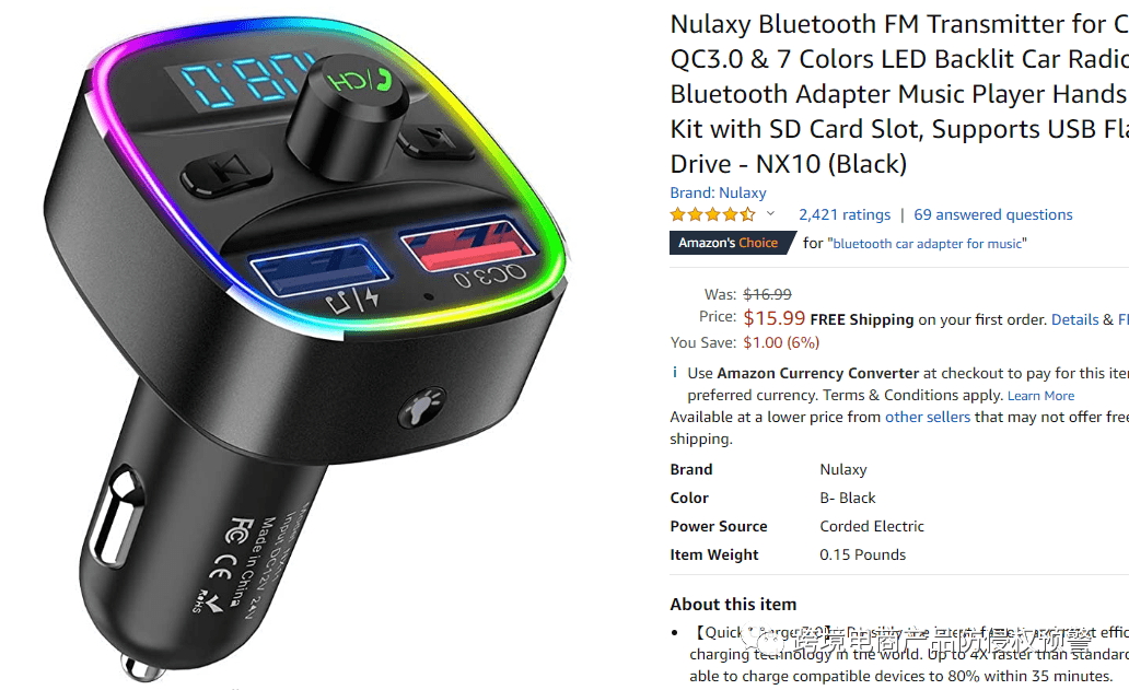 下面这款车载蓝牙适配器,目前它是亚马逊美国站的Amazons Choice,现有评论数2421,售价15.99美元: