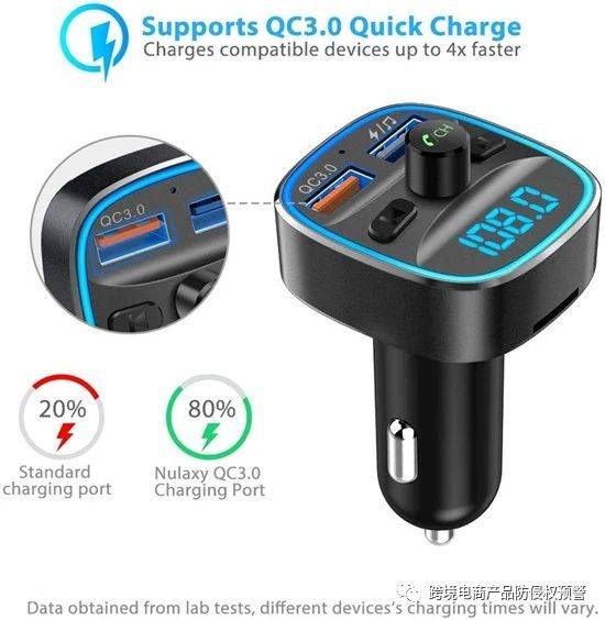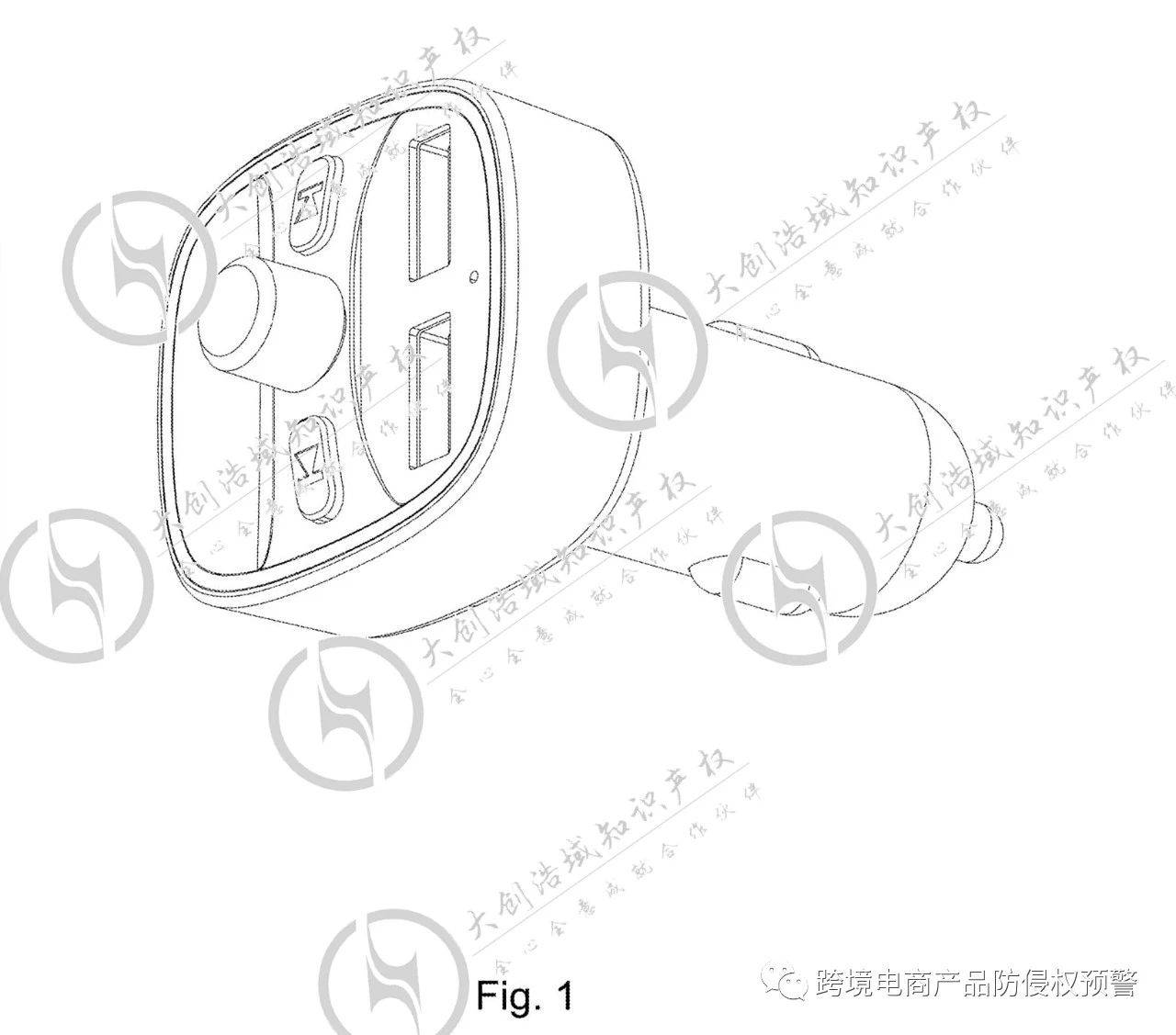 经定向检检索这款产品在美国的专利背景,检索到这款车载蓝牙适配器是有美国外观专利的,而且专利权人属于一家广东的企业,下面是这款产品的美国外观专利图截图: