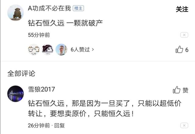 但有网友质疑称,人造钻石技术可能会导致钻石价值贬值,甚至有网友拿世界著名的珠宝商戴比尔斯公司最经典广告词“钻石恒久远,一颗永留传”开涮,调侃道:钻石恒久远?一颗就破产。