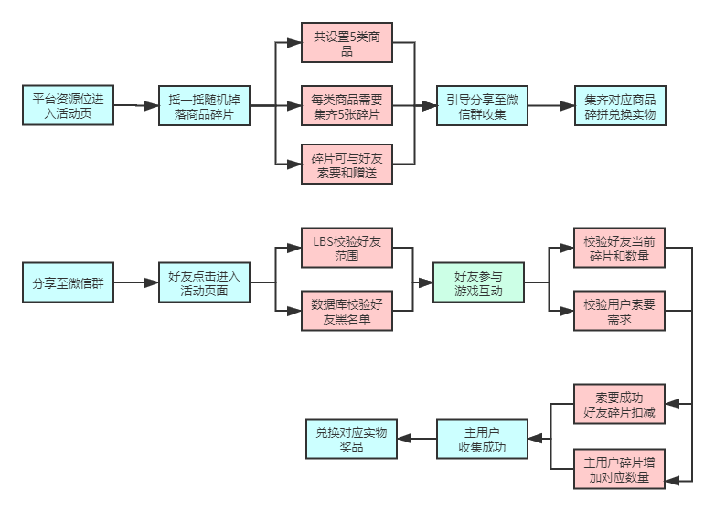 玩法逻辑:A用户进入活动页摇一摇→随机掉落商品碎片→所有碎片可与微信群好友索要与赠送→通过好友的交换和摇一摇→碎片收集完成兑换对应的实物奖品。