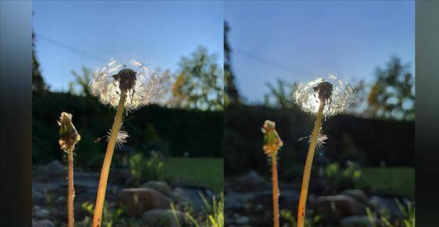 在这组室外环境中的拍照对比,可以看到iPhoneSE2020拍摄的照片中,蒲公英的根茎部分发白比较明显,而华为P40拍摄的照片中的蒲公英根茎部分发白则没那么明显。iPhoneSE2020和华为P40均是在逆光环境中进行的拍照对比,除了根茎区域的颜色明暗不同之外,照片上半部分的表现基本上保持一致。