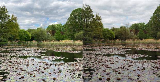 不过同样是在室外环境中的拍照对比,iPhoneSE2020则和华为P40之间呈现出了相反的拍照效果,iPhoneSE2020拍摄的照片中,池塘表面的颜色较亮,并且有局部反光的现象。而华为P40拍摄的照片中,池塘表面的亮度较低,整体的拍照效果则较为昏暗,效果明显不如iPhoneSE2020。同时照片中的远处树木的表面明暗程度也有所不同,iPhoneSE2020的整体的拍照效果较为明亮,而华为P40拍摄的树木整体则较为昏暗。