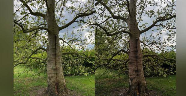 在树林当中光线不是足够强烈的环境当中,iPhoneSE2020拍摄的照片曝光度依然是比华为P40要高一些,可以看到iPhoneSE2020拍摄的照片中树干表面的纹路,尤其是树皮表面的纹路表现比较清晰,并且树干表面的颜色也呈现灰色。华为P40拍摄的照片中树干的颜色则呈现出绿色多一些,不过由于照片整体的亮度较暗,所以树干表面的纹路细节表现则不够清晰。