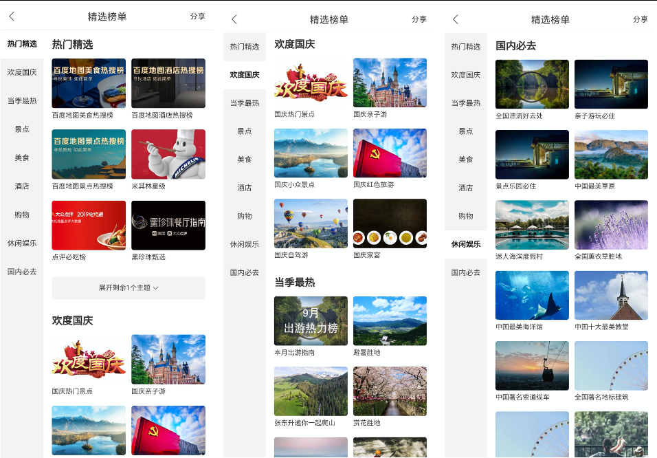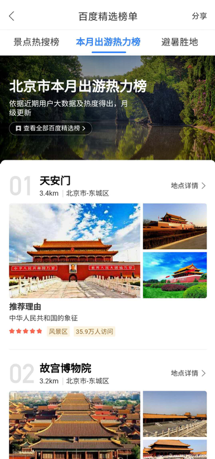 据了解,百度地图此次推出的“本月出游热力榜单”,是根据过去两年的导航大数据甄选而来,并会以月为单位更新,从而用真实的历史数据让用户的出游安排更“有据可依”。目前,本月出游热力榜单已覆盖全国超过300个城市,从小众景点到网红美食、从人气酒店到购物圣地均有所覆盖。在首批上线的夏季景点和美食专题中,共有全国200多个城市的13类专题榜入选,9月底又推出了“国庆吃喝玩乐专题”,用户可以自由切换浏览各大专题榜,更快找到值得一去的好去处。