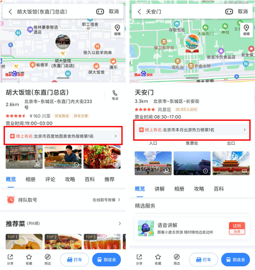 如何查找百度地图“本月出游热力榜”?用户只需在百度地图中搜索“热搜榜”或直接说出“小度小度,热搜榜”,即可查看本市精选榜单。榜单中,每一个景区或餐厅的推荐理由、特色标签、人均花费、距离、菜品及环境都一一写明。不仅如此,若用户直接搜一家餐厅或景区时,不仅能看到这里是否“榜上有名”,还能看到具体入榜排名信息。从百度地图“本月出游热力榜”中可以看出,北京市9月美食热搜榜第一名的是北京市胡大饭馆(东直门总店),而出游热力榜第一名则是。十一出游前用百度地图提前种草人气好去处,即使是初次到访的城市,也可以感受“跟着榜单出游如此简单”的便利感。