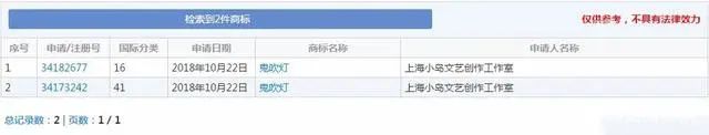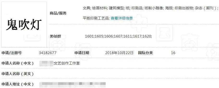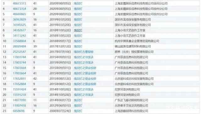 据中国商标网显示,目前共有40余件包含“鬼吹灯”字样的商标信息,申请人涵盖北京、上海、广州、深圳、杭州、香港等地的多家企业;