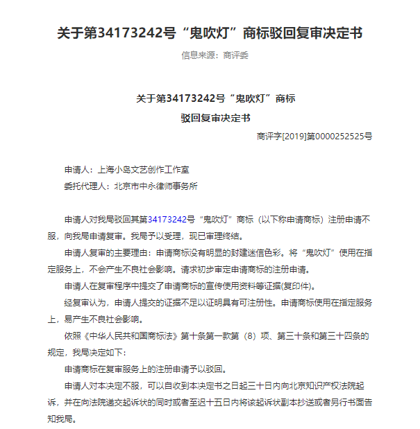 上海小岛文艺创作工作室(下称小岛工作室)近日欲将“鬼吹灯”三字作为商标申请注册使用在“教育、组织表演(演出)海报杂志(期刊)等商品及剧本编写、书籍出版”等服务上;但却被商标局再三驳回,驳回原因是其含有封建迷信色彩......