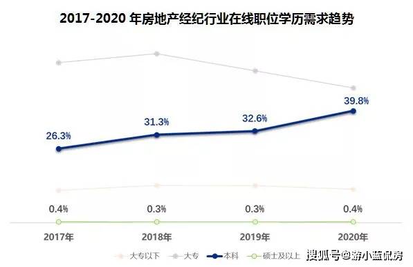 2017-2020年,房地产经纪行业本科及以上人才需求占比由26.7%上涨到40.2%,房地产经纪行业整体人才质量提升需求迫切。