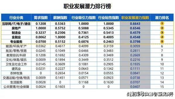 根据智联招聘近3年15大类行业25189万在线万投递行为数据,《报告》显示,2020-2025最具发展潜力的五大行业分别为互联网/IT/电子/通信、房地产、制造业、金融业和专业服务。房地产排行第二。