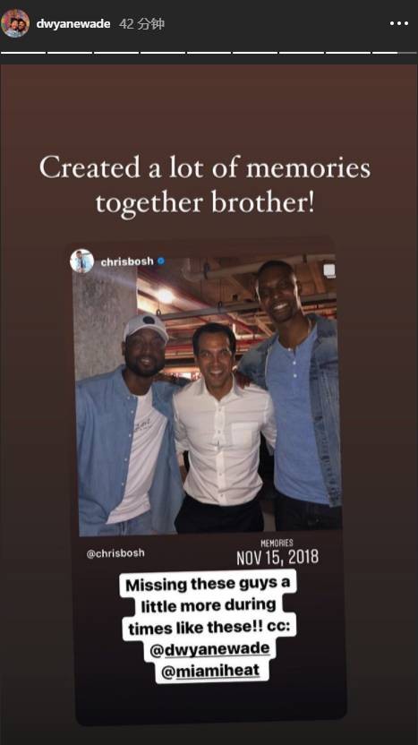 韦德也转发了动态并回复:“我们一起创造了很多回忆啊兄弟!”