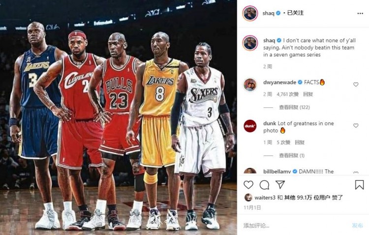 奥尼尔此前就曾在INS晒出过自己心目中的最佳阵容,艾弗森+科比+詹姆斯+乔丹,再加上自己。