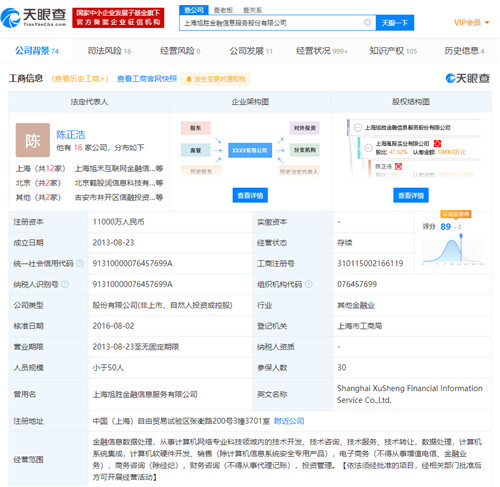 天眼查APP显示,上海旭胜金融信息服务股份有限公司为钱多多关联公司,成立于2013年8月,注册资本1.1亿元,法定代表人为陈正浩,经营范围包括金融信息数据处理,从事计算机网络专业科技领域内的技术开发、技术咨询、技术服务、技术转让,数据处理,计算机系统集成等,该公司第一大股东为上海胤振实业有限公司,持股比例47.62%,陈正浩本人为公司第二大股东,持股比例23.33%。