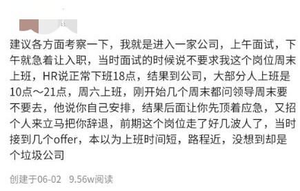 职Q上就有网友吐槽自己进入一家公司就是上午面试,下午就入职。面试时说好公司正常18点下班,周末不加班。结果不仅每天要加班到21点,周末还需要加班。