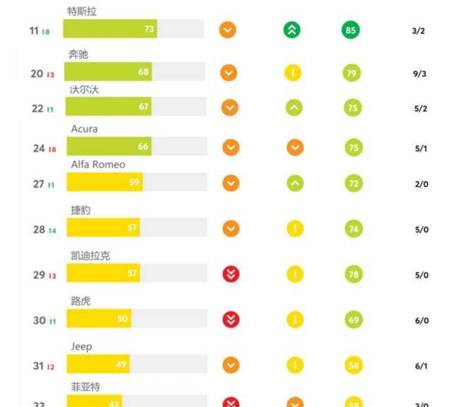 值得注意的是,在可靠性方面栽跟头豪华和高端品牌不在少数,特斯拉、奔驰、沃尔沃、捷豹、阿尔法罗密欧、凯迪拉克、路虎、捷豹纷纷在列。这几个品牌其实在近几年的车坛热搜中,经常以召回和不靠谱的新闻上榜,如特斯拉的自动驾驶不可靠,自燃和爆炸、奔驰避震异响断裂,