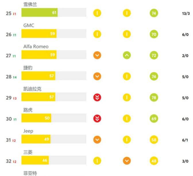 60分的八个品牌中,美系占据了半壁江山,其中菲亚特以43分垫底,Jeep以49分倒第三,雪佛兰以61分勉强合格。另外四个品牌为阿尔法·罗密欧、捷豹、路虎、三菱。