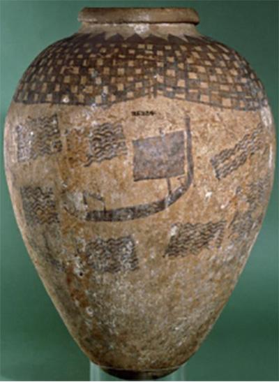 另一个历史早期的例子则来自古埃及。下图是出土于埃及格尔塞(距开罗约80千米,位于尼罗河西岸)一处墓葬遗迹的一只陶罐,属于涅伽达文化II期(又称格尔塞时期),表面上绘有已知世界上最古老的帆船图案。对此,一个有趣的发现是,这只陶罐的年代约为公元前3200年,恰好是上下埃及统一的前夕。位于尼罗河上游的上埃及在技术方面较为先进,领先于位于尼罗河三角洲的下埃及。然而,由于尼罗河的流向是自南向北的,因而上下埃及之间通过河运而建立的联系只能是单向的。