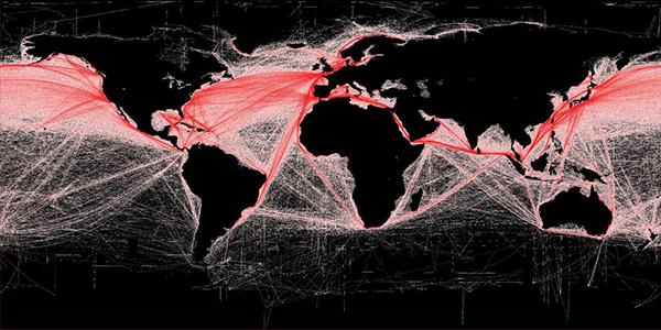 全球海运航线图。如今,海运航线已经覆盖了全球的几乎每一个角落,承担着无数人员、商品和物资的交流与运输,成为全球化的重要渠道和动力。