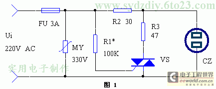 该装置的电路见图1(点击下载原理图)。它是由主要元件—压敏电阻MY和双向可控硅VS组成。MY的主要作用是吸收电网杂波脉冲,防止开机瞬间的大电流冲击,由于它处于彩电电源的第一道关口,有净化电网电源、减小干扰、使屏幕图像更加清晰的功效;VS是电子开关,它能在电网错相时迅速导通产生强大的短路电流使保险丝FU熔断,从而切断供给彩电的电源。具体工作过程如下:当市电电网电压正常时,VS因触发电流不足而处于截止状态,彩电得电而正常工作。一旦发生错相事故,会导致输入电压上升至380V,此时VS迅速被触发导通,在错相的瞬间,由于R2和R3的分压作用,使输入到彩电中的电压仅为UO=Ui×R3/(R2+R3)≈230(V),这个电压值不会损坏彩电。与此同时,VS的导通会使保护器电路电流猛增,FU迅速熔断而切断电源。
