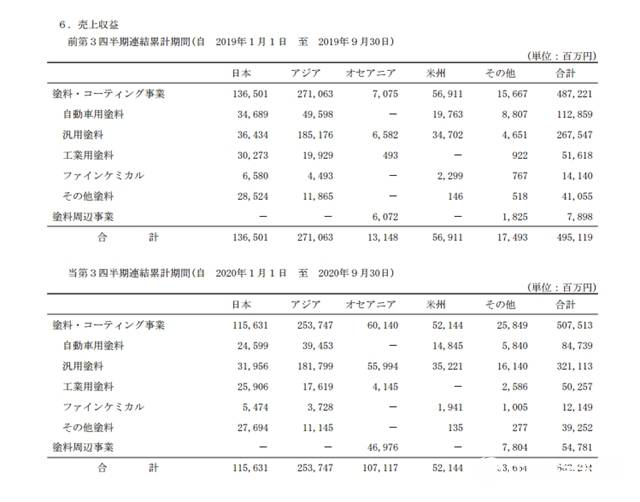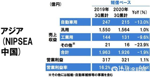其中建筑涂料销售收入1564亿日元(约合人民币98.74亿元),同比增长1%;汽车涂料销售收入215亿日元(约合人民币13.57亿元),同比下降13%;工业涂料销售收入131亿日元(约合人民币8.27亿元),同比下降9.6%;其他业务销售收入16亿日元(约合人民币1.01亿元),同比下降23.9%。前三季度实现营业利润为321日元(约合人民币20.27亿元),同比增长1.1%。
