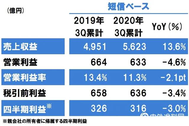 报告显示,立邦控股2020年前三季度合并销售收入为5623亿日元(约合人民币355亿元),同比去年4951亿日元增长13.6%;营业利润为633亿日元(约合人民币39.96亿元),同比去年664亿日元下降4.6%。经营前利润为635.72亿日元(约合人民币40.14亿元),同比去年658亿日元下降3.4%; 归母净利润316.37亿日元(约合人民币19.97亿元),同比去年326亿日元下降3.0%。