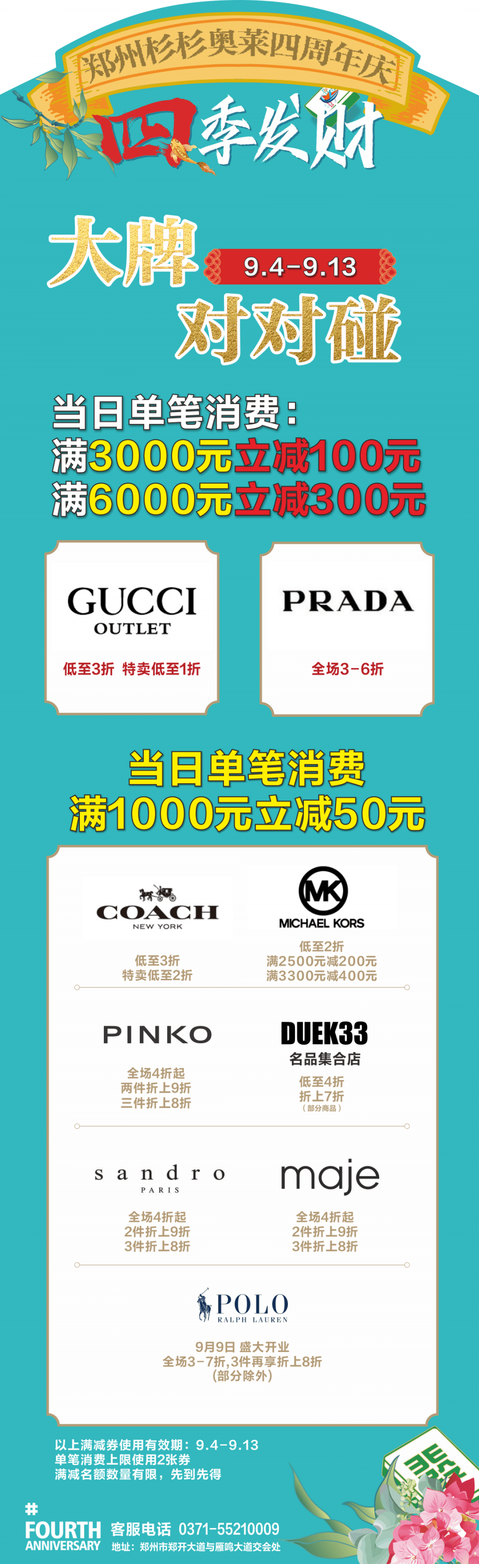 大牌对对碰。9月4日至13日,GUCCI、PRADA、COACH等大牌不仅推出当日单笔消费满6000元立减300元、满3000元立减100元、满1000元立减50元的优惠福利,还有诚意满满的折扣,GUCCI(OUTLET)低至3折,特卖低至1折;而PRADA则推出了全场3-6折活动。COACH全场低至3折,特卖低至2折,PINKO全场4折起,两件折上9折,三件8折;MK全场低至2折,满2500元减200元,满3300元减400元;DUEK33名品集合店,全场低至4折,折上7折……,将于9月9日盛大开业的POLO也拿出了开业“见面礼”,全场3~7折,3件再享折上8折(具体规则询店员)。满减券数量有限先到先得,单笔消费上限使用2张。