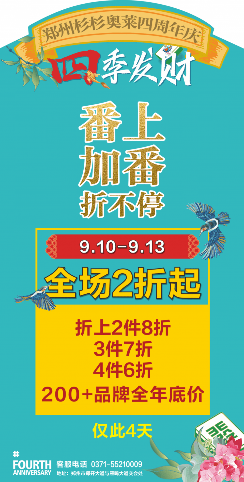 郑州杉杉奥特莱斯即将迎来4周年“四季发财”年度狂欢盛宴,此次周年庆,商场联合品牌方给消费者带来了超级福利,不仅价格全年最低,全场2折起,折上2件8折,3件7折,4件6折仅此4天;还有超多有趣玩法等待解锁。9月10日至13日,来杉杉奥莱,即刻开启欢购之旅。