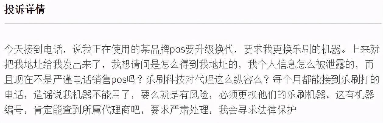 据用户爆料称,乐刷公司的从业人员通常会以违规的电销方式来推广POS机。往往会以用户正在使用的某品牌POS要升级换代为由,要求用户更换乐刷的POS机,几乎每个月都能接到乐刷打的电话,造谣说自己的机器不能用了,要么就是有风险,必须更换他们的乐刷机器。