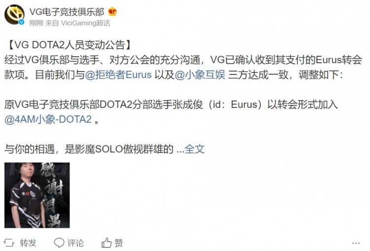 经过VG俱乐部与选手、对方公会的充分沟通,VG已确认收到其支付的Eurus转会款项。目前我们与拒绝者Eurus 以及小象互娱 三方达成一致,调整如下: