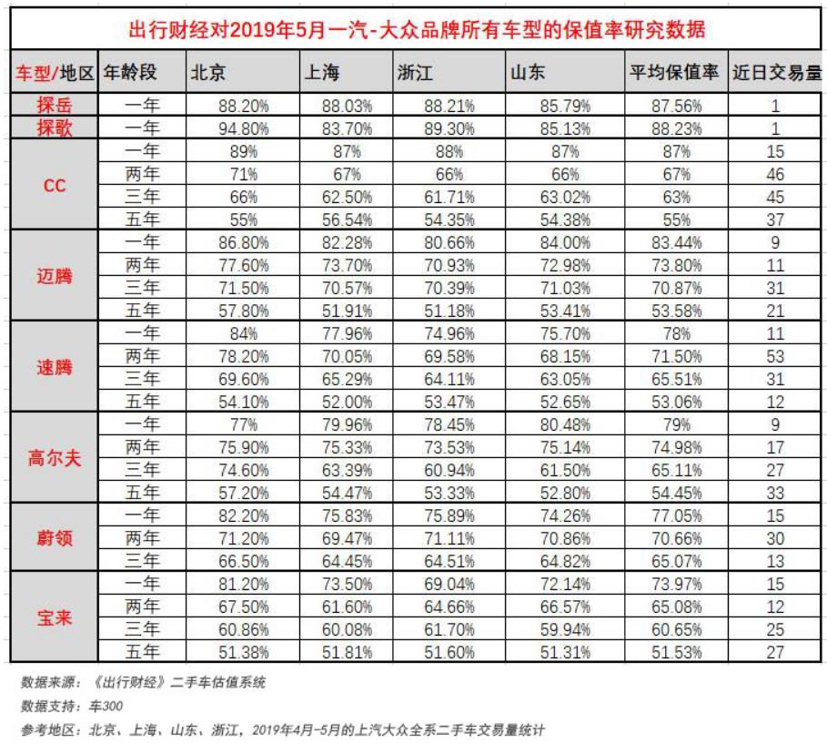 《出行财经》此前对产品保值率的研究也证明一汽-大众在存量市场时代更具竞争力。根据中国汽车流通协会的最新数据,大众品牌在购买3年后的平均保值率为63.8%;而在我们抽查的北京上海、浙江、山东四省市的同时间段的二手车保值率对比发现品牌产品的保值率远高于上述标准(详见《1-4月累计销量第一,一汽-大众成长韧性研究(产品篇)》)。