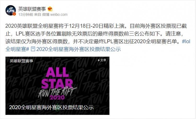 请注意,该结果仅为海外赛区得票数,并不决定最终LPL赛区出征2020全明星赛名单。以上最终得票数将和在随后进行的LPL赛区投票中获得的总票数相加后,由每个位置得票第一的选手代表LPL出征今年的2020英雄联盟全明星赛(ASE 2020)。