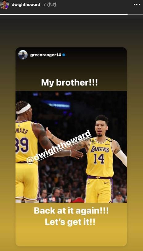 直播吧11月22日讯76人球员丹尼-格林今日在个人社交媒体发布多条动态,向今日完成签约的球员好友表示祝贺。其中,对新赛季即将在费城重聚的老队友霍华德,格林也是晒出旧照并写道:“我的兄弟!!!再一次回归