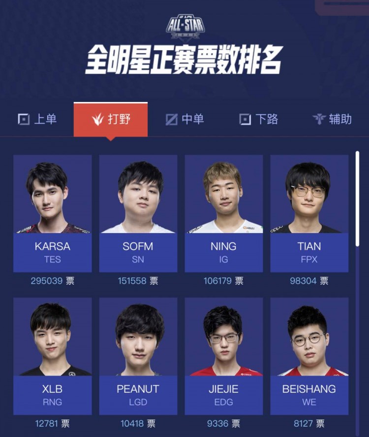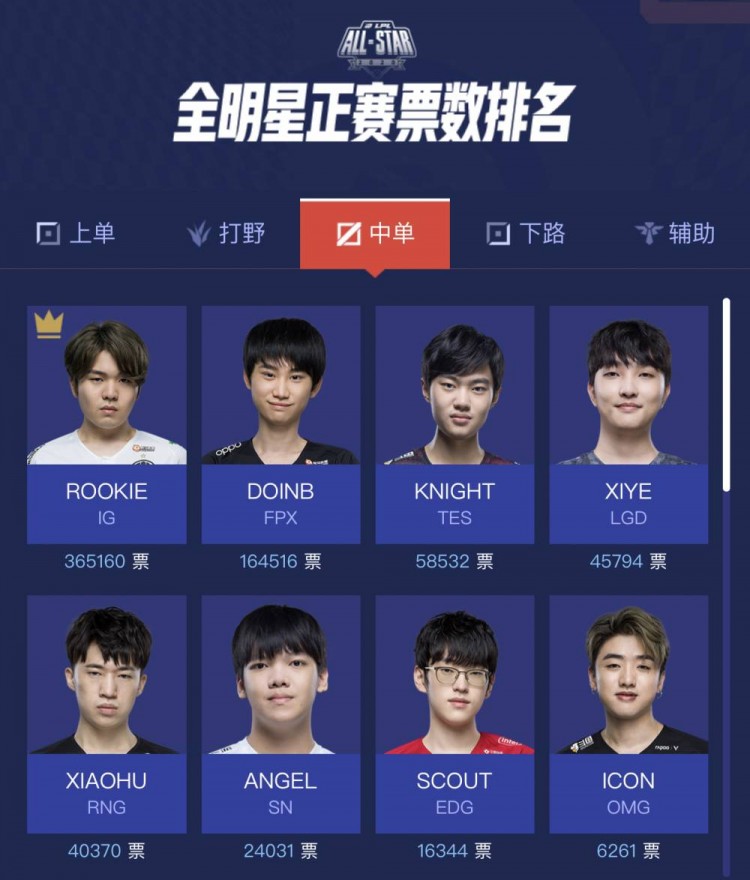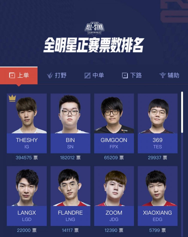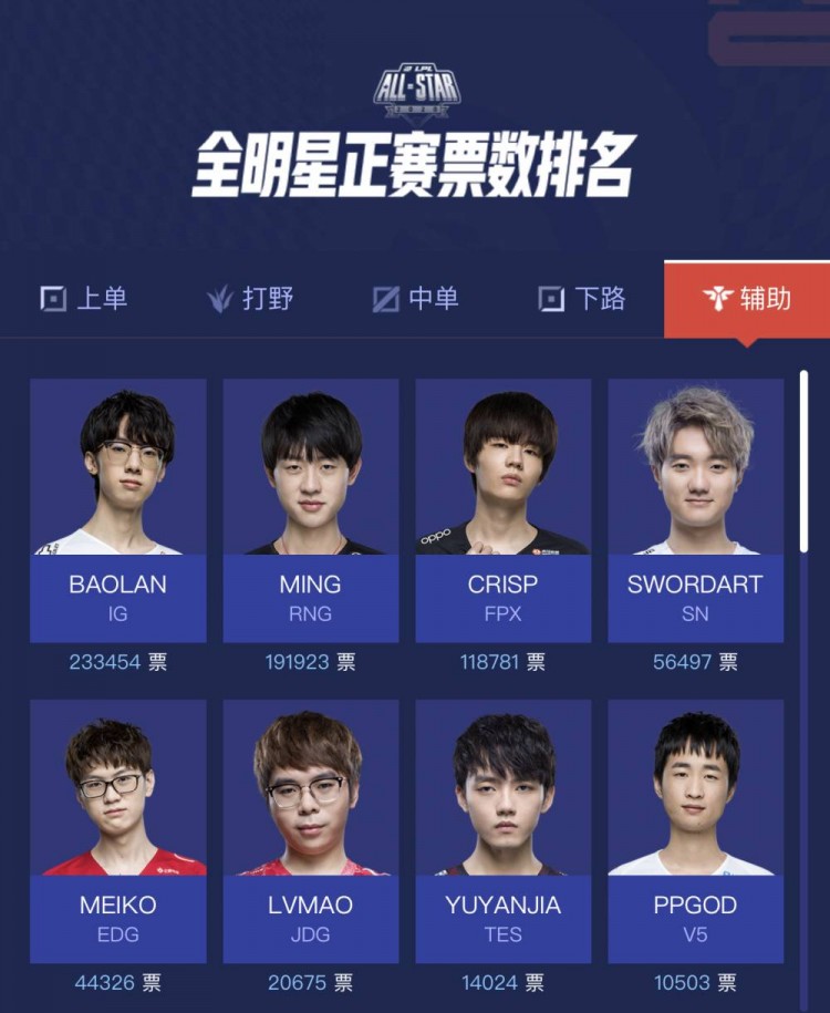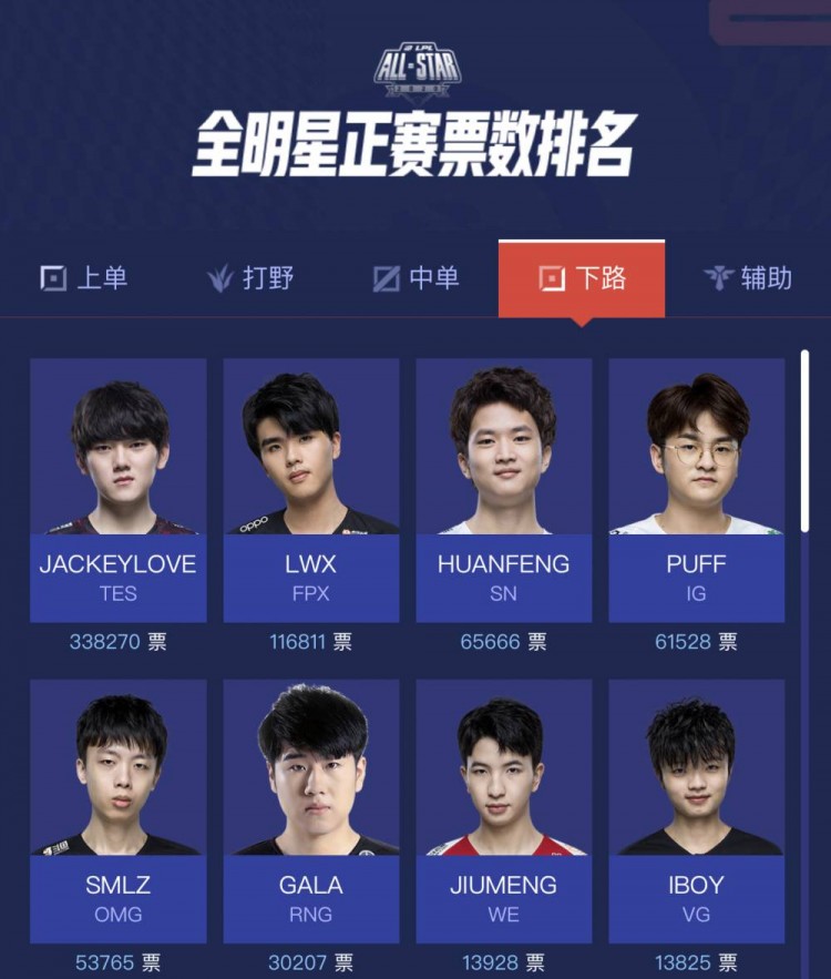 11月22日讯 截止下午2点前,LPL全明星投票情况:各位置头名没有变化,依旧是原IG冠军人员占领四个席位。