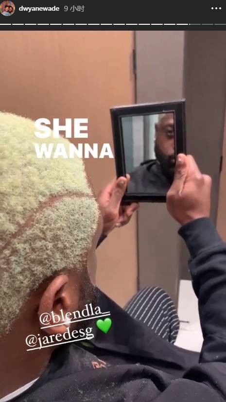 直播吧11月26日讯热火名宿韦德今日更新个人社交媒体,晒出自己刚染的新发型,由于韦德用了同样的绿色心形表情,来标注自己的头发和拇指上的装饰,我们只能姑且将韦德的发色称为浅绿色。除了新发型,韦德还在自己