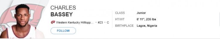 11月27日讯西肯塔基大学以75-69战胜孟菲斯,查尔斯-贝西(Charles Bassey/211公分,107公斤)的赛季第二战。