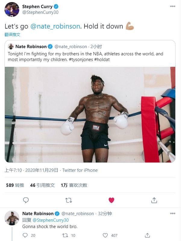库里转推为内特助力,库里写道:“加油@内特-罗宾逊,把他拿下!”