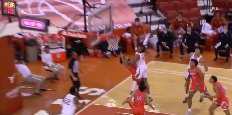 直播吧11月26日讯NCAA的季前赛今日已经开打,2020级第九高中生,德克萨斯大一前锋格雷格-布朗迎来首秀。布朗很快在自己的大学生涯首战贡献五佳镜头,18岁的布朗在右侧弧顶三分线接球,差点丢球,随后